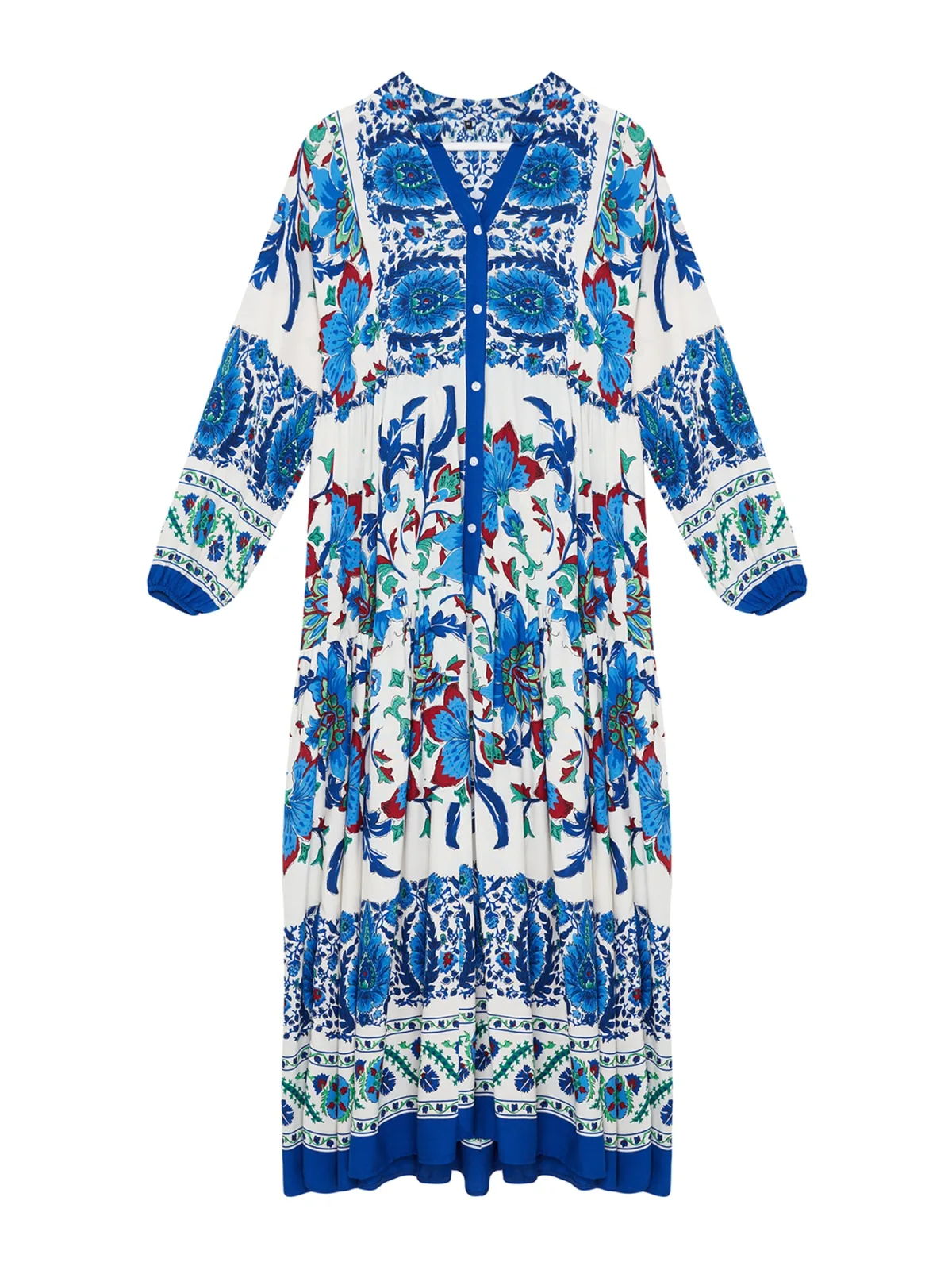 Design: Gevoerde zoom/rand, Placket, Pofmouwen; Type sluiting: Knoopsluiting; Materiaal: Viscose; Halstype: Opstaande kraag; Motief: Bloemenprint; Details: Volant, Gedrapeerd; Extra's: All-over patroon, Koele grip; Lengte: Lang/maxi; Snit: Uitlopend; Pasvorm: Wijde pasvorm; Armlengte: Lange mouw