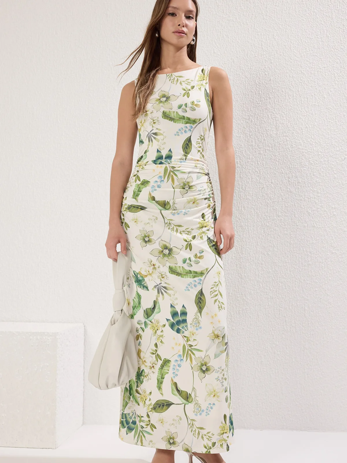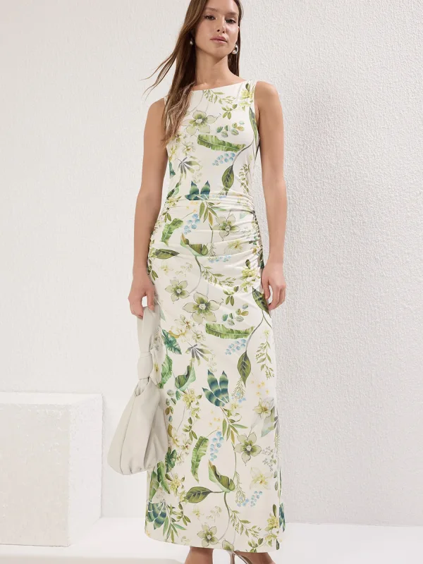 Design: Gevoerde zoom/rand, Rechte zoom; Materiaal: Jersey; Halstype: Boothals; Motief: Bloemenprint; Soort bandjes: Brede bandjes; Details: Gedrapeerd; Extra's: All-over patroon, Voelt zacht aan; Lengte: Lang/maxi; Snit: Getailleerd; Pasvorm: Slanke pasvorm; Armlengte: Mouwloos