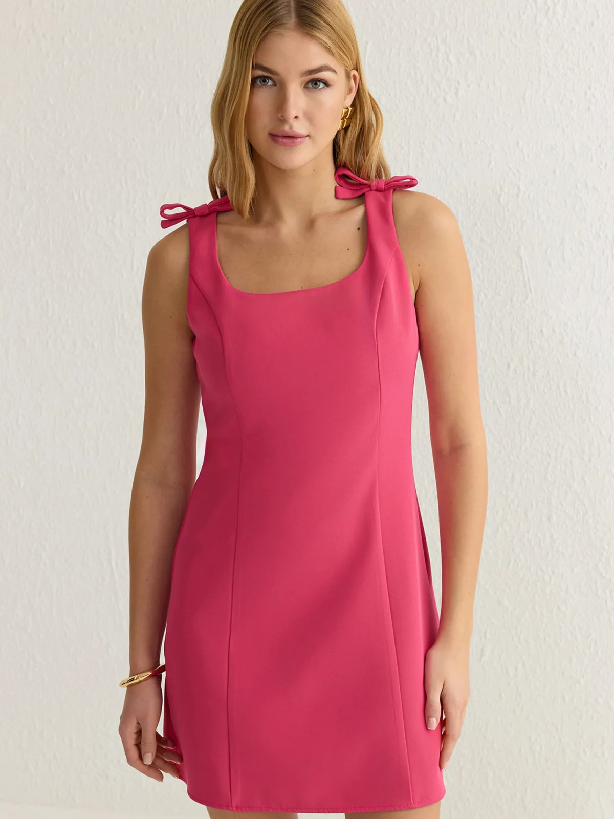 Design: Gevoerde zoom/rand, Rechte zoom, Deelnaden; Type sluiting: Ritssluiting; Halstype: Carréhals; Motief: Effen; Soort bandjes: Normale bandjes; Extra's: Op staal naden, Vaste grip; Lengte: Kort/mini; Snit: Getailleerd; Pasvorm: Normale pasvorm; Armlengte: Mouwloos