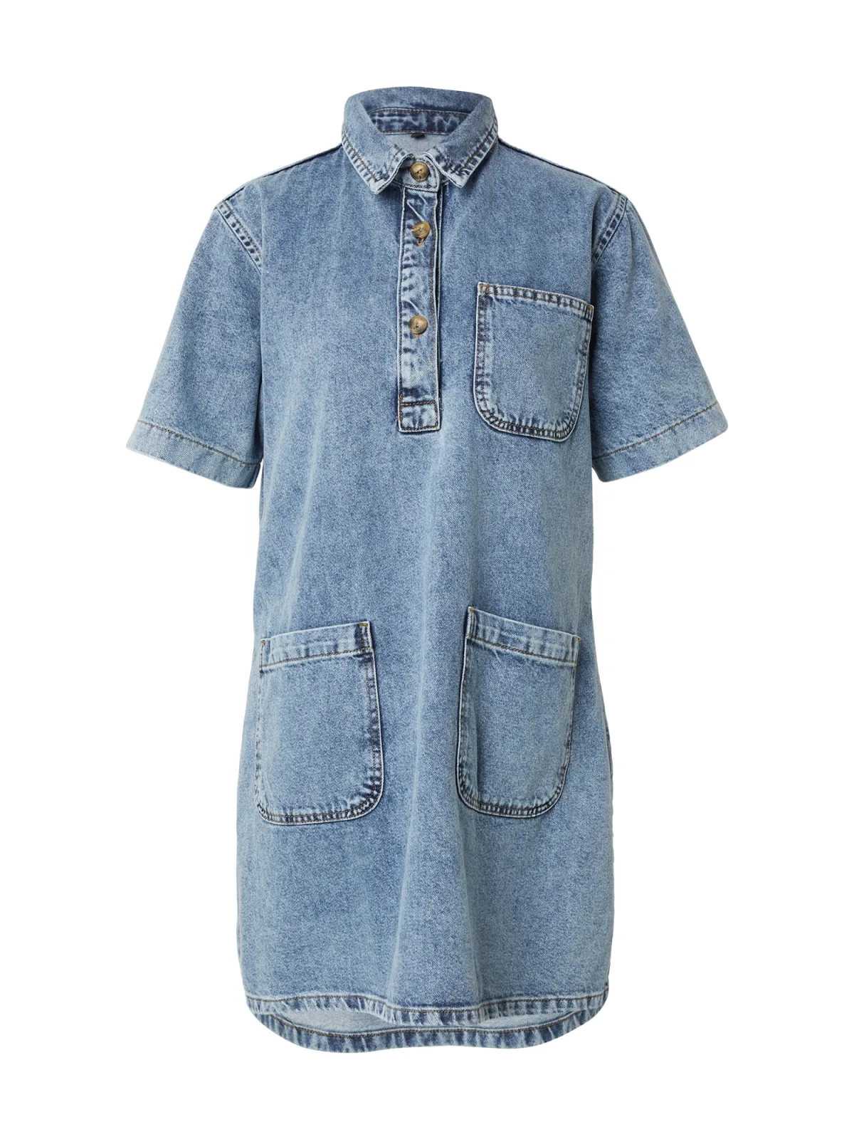 Design: Turn-down kraag, Opgezette zakken; Type sluiting: Knoopsluiting; Materiaal: Denim; Halstype: Polokraag; Motief: Effen; Extra's: Contrasterende naden, Gewassen effect; Lengte: Kort/mini; Snit: Uitlopend; Pasvorm: Losse pasvorm; Armlengte: Halve mouw