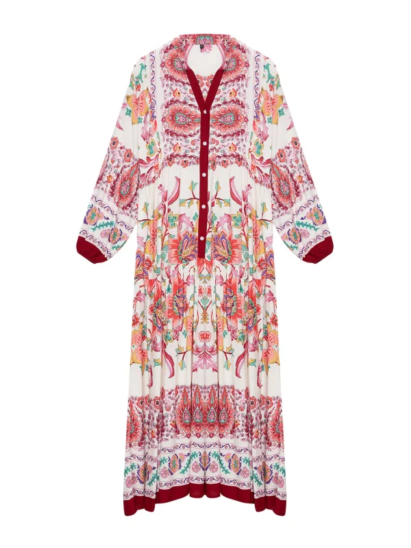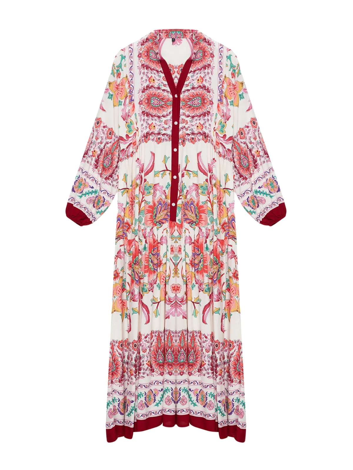 Design: Gevoerde zoom/rand, A-lijn, Rechte zoom, Knop placket; Type sluiting: Knoopsluiting; Materiaal: Viscose; Halstype: Opstaande kraag; Motief: Bloemenprint; Details: Volant, Gedrapeerd; Extra's: All-over patroon, Gladde stof; Lengte: Lang/maxi; Snit: Uitlopend; Pasvorm: Wijde pasvorm; Armlengte: Lange mouw