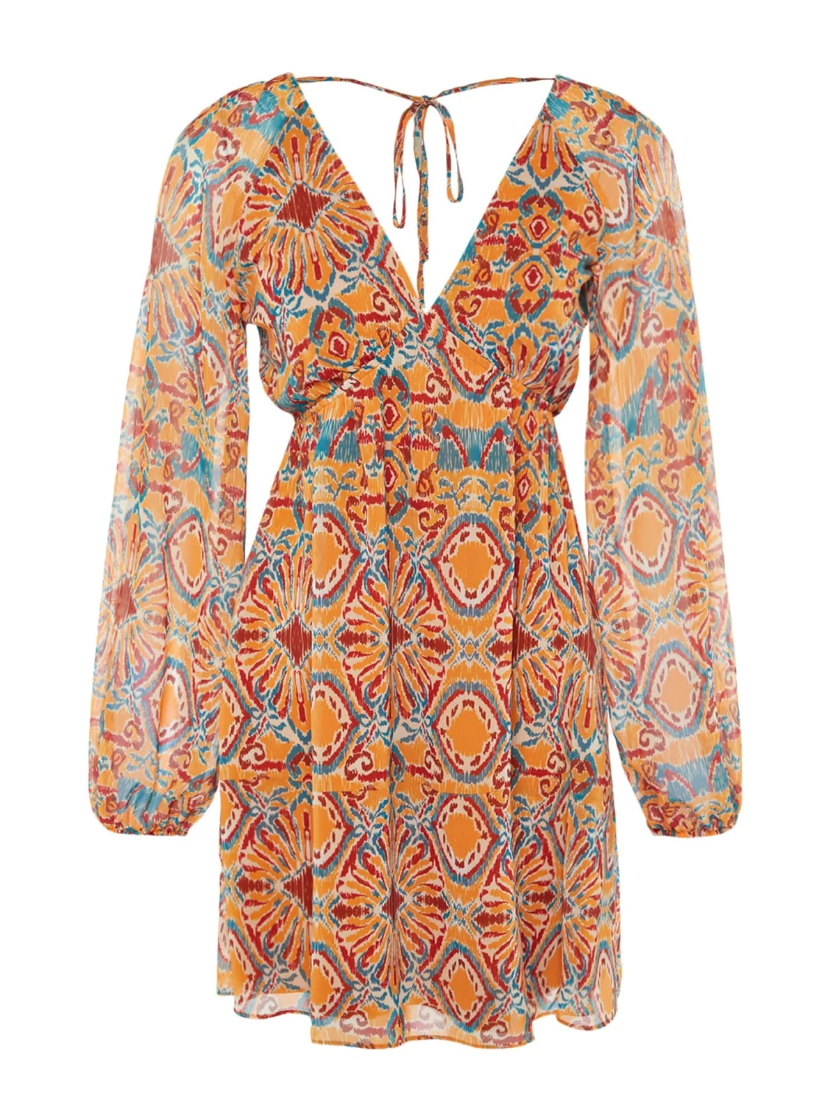 Design: Gevoerde zoom/rand, Raglanmouwen, Diepe snit/decolleté, Om te knopen/binden, Uitgesneden rug; Halstype: V-hals; Details: Gedrapeerd, Backless; Extra's: All-over patroon, Lichte stof; Lengte: Kort/mini; Snit: Uitlopend; Pasvorm: Normale pasvorm; Armlengte: Lange mouw