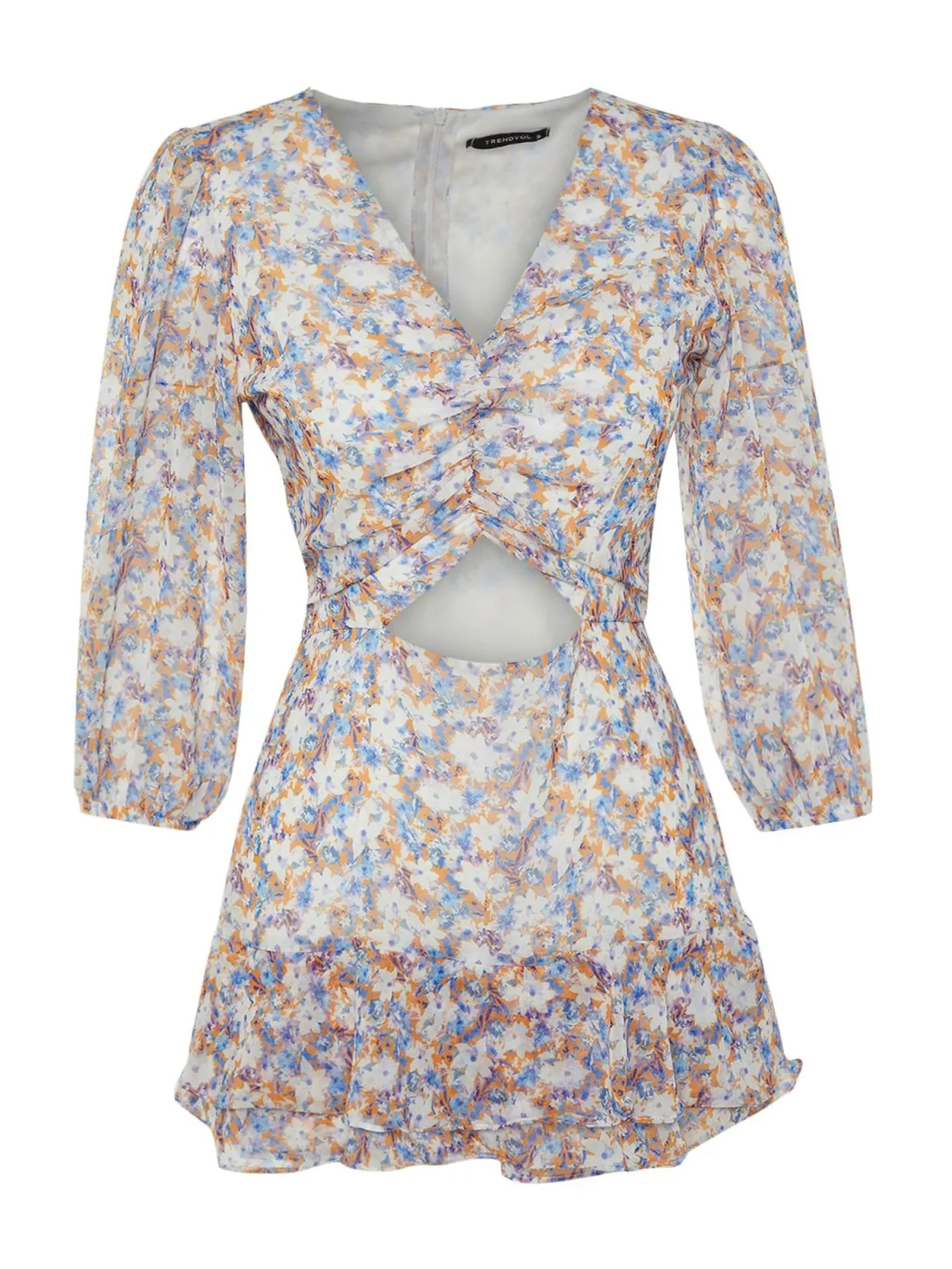 Design: Pofmouwen; Halstype: V-hals; Motief: Bloemenprint; Details: Cut-outs, Volant, Gedrapeerd; Extra's: All-over patroon, Lichte stof; Lengte: Kort/mini; Pasvorm: Normale pasvorm; Armlengte: Driekwart mouw