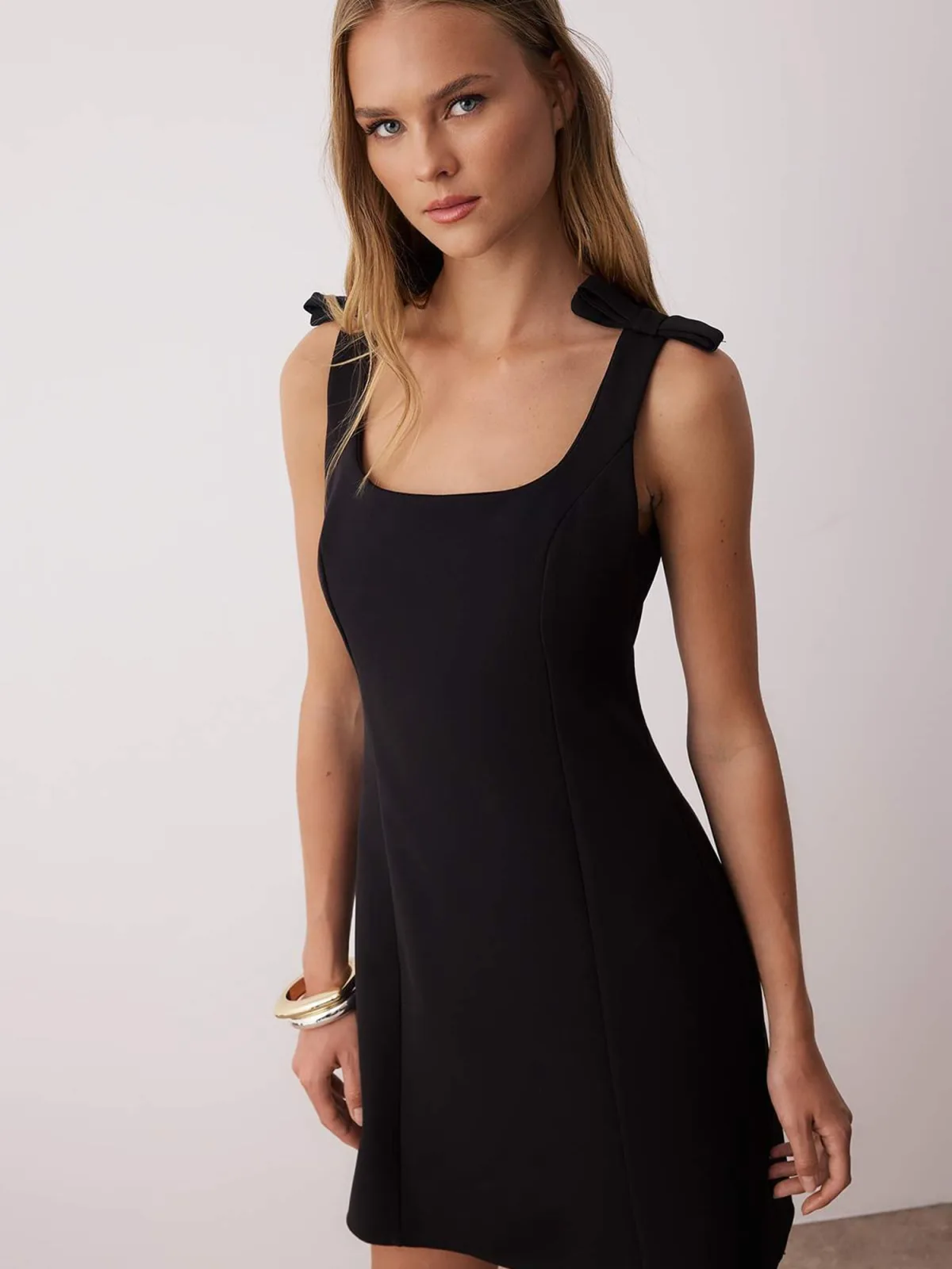 Design: Gevoerde zoom/rand, Rug rits, Getailleerd model; Type sluiting: Ritssluiting; Halstype: Carréhals; Motief: Effen; Soort bandjes: Normale bandjes; Extra's: All-over patroon, Op staal naden, Met textuur; Lengte: Kort/mini; Snit: Getailleerd; Pasvorm: Normale pasvorm; Armlengte: Mouwloos