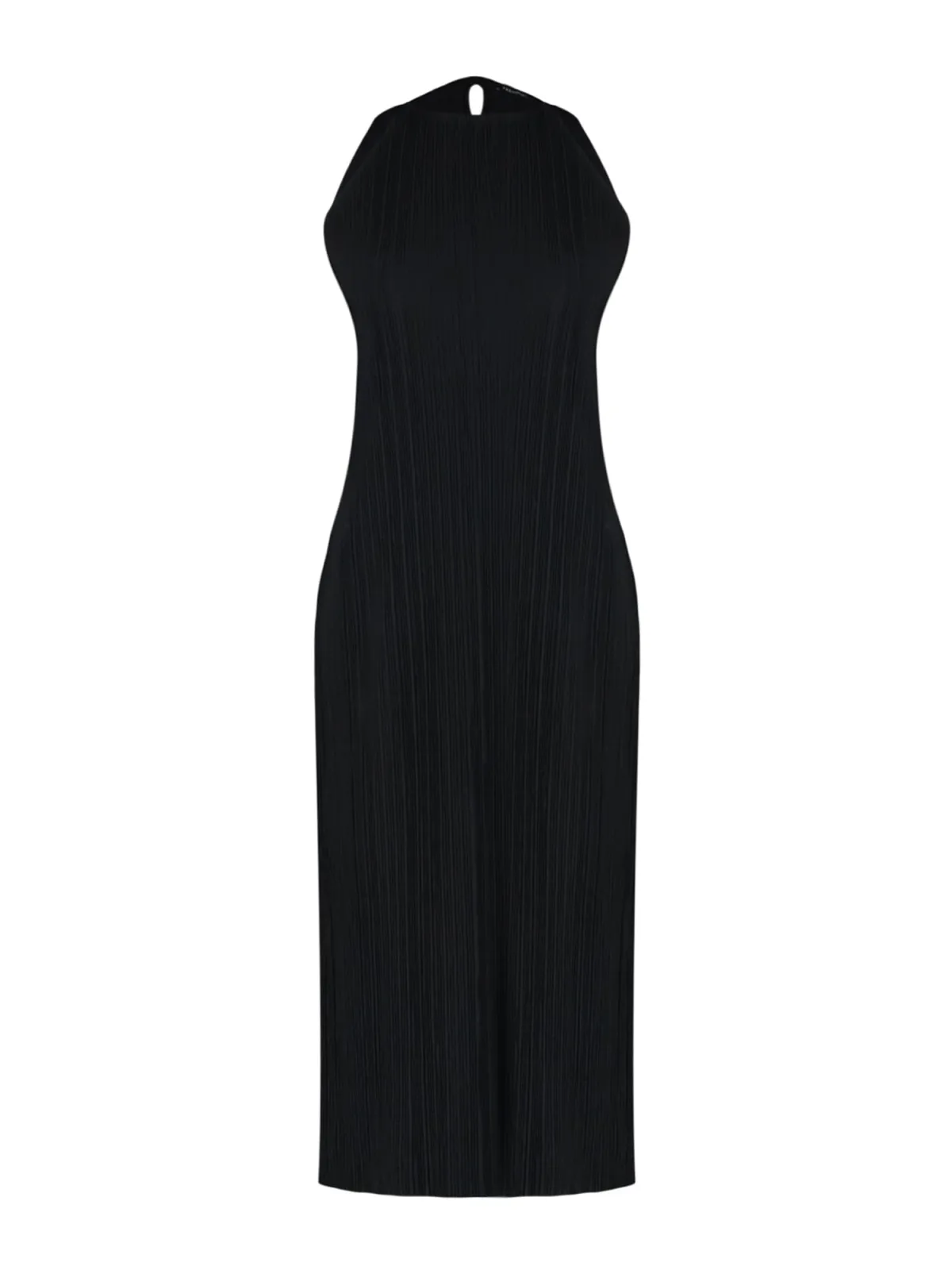 Design: Rechte zoom, Keyholesluiting; Type sluiting: Knoopsluiting; Halstype: Ronde hals; Motief: Effen; Soort bandjes: Haltermodel; Details: Cut-outs, Plissé; Extra's: Op staal naden, Gladde stof; Lengte: 3/4 lengte; Snit: Recht; Pasvorm: Normale pasvorm; Armlengte: Mouwloos