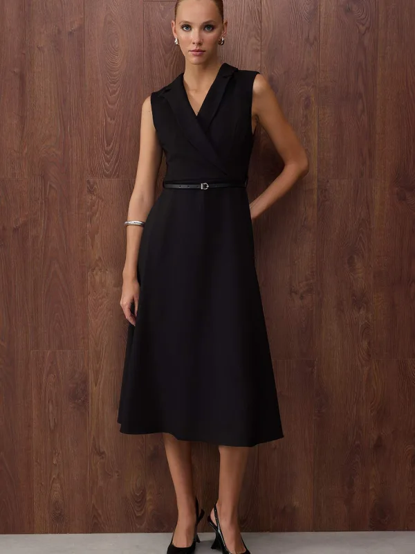 Design: Gevoerde zoom/rand, Wikkel-look, Tailleriem; Type sluiting: Knoopsluiting; Halstype: Wikkeltop; Motief: Effen; Soort bandjes: Brede bandjes; Extra's: Op staal naden, Gladde stof; Lengte: 3/4 lengte; Snit: Getailleerd; Pasvorm: Normale pasvorm; Armlengte: Mouwloos