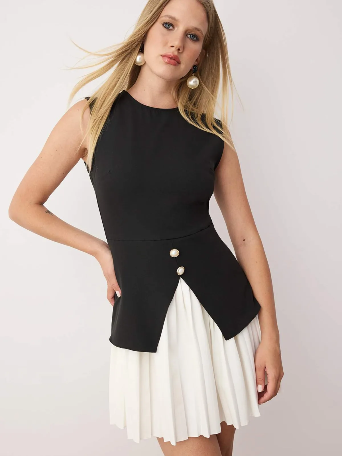 Design: Recht model, Gelaagde look; Halstype: Ronde hals; Motief: Color-Blocking; Soort bandjes: Brede bandjes; Details: Plissé; Extra's: All-over patroon, Op staal naden; Lengte: Kort/mini; Snit: Getailleerd; Pasvorm: Normale pasvorm; Armlengte: Mouwloos