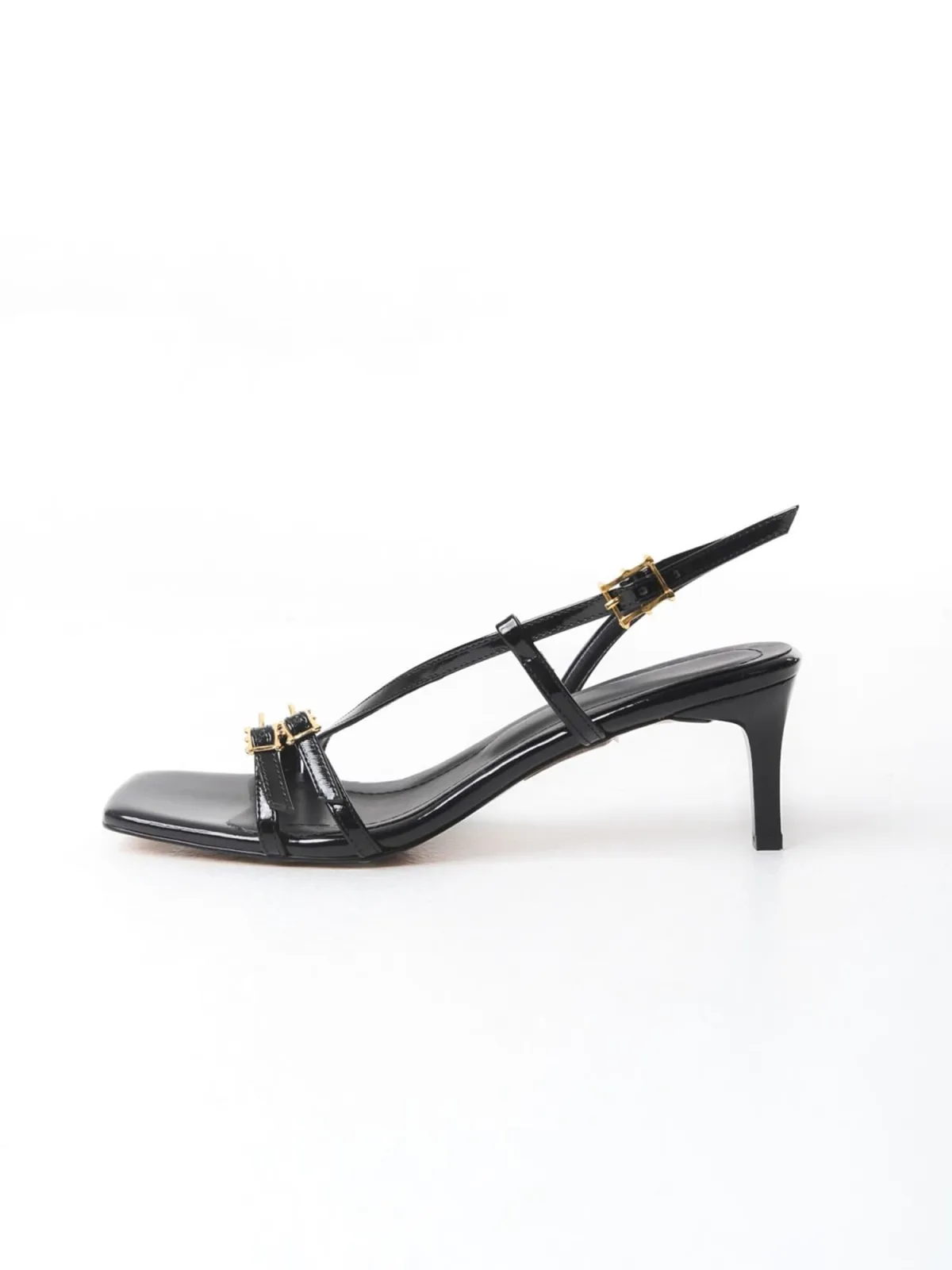 Design: Gevoerd, Gesp; Type sluiting: Gesp; Type hak: Stiletto; Motief: Effen; Materiaal: Imitatieleer; Schoenneus: Open toe; Extra's: Glanzend, Flexibele zool; Hakhoogte: Middelhoge hak (3-7 cm)