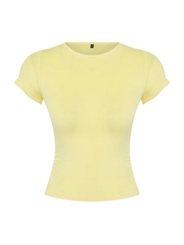 Design: Gevoerde zoom/rand, Nektape; Materiaal: Jersey; Halstype: Ronde hals; Motief: Effen; Details: Gedrapeerd; Extra's: Op staal naden, Voelt zacht aan; Pasvorm: Slanke pasvorm; Armlengte: Kwartmouw; Lengte: Korte pasvorm