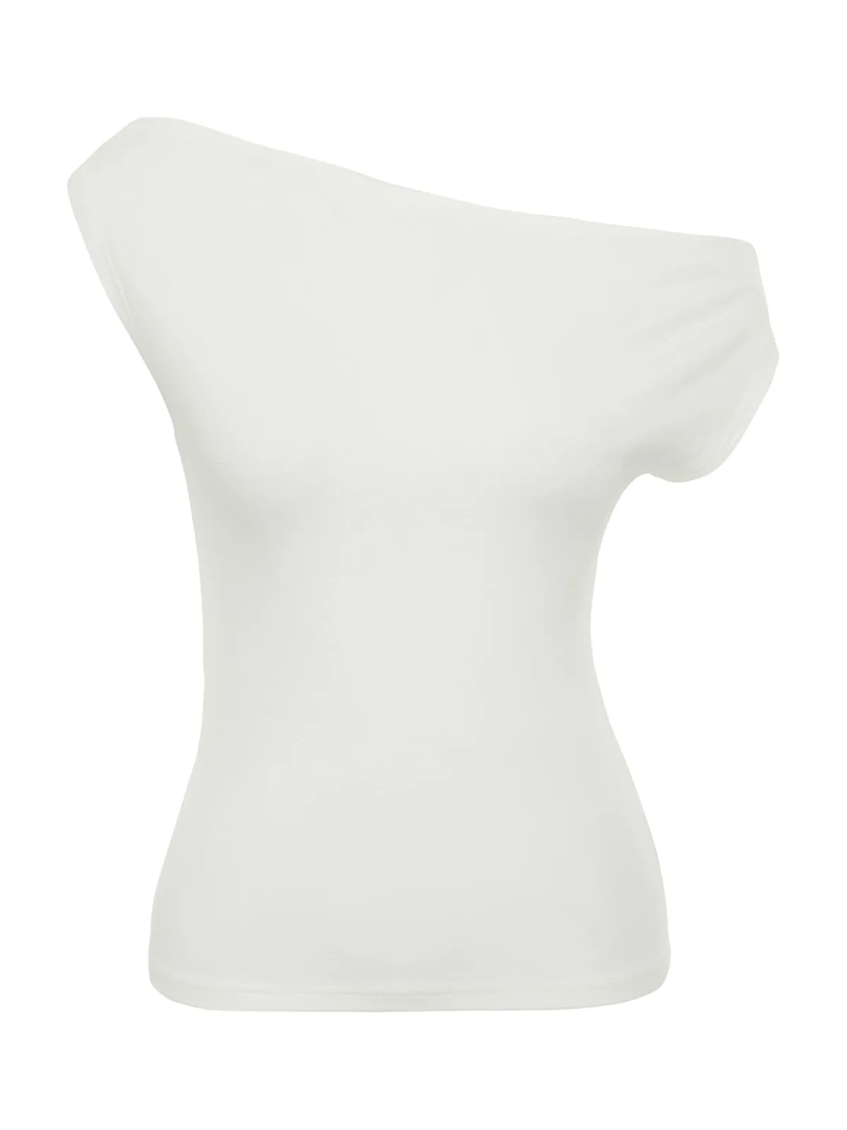 Blouse type: Blouseshirt; Design: Gevoerde zoom/rand, Asymmetrische zoom, Strapless/off-shoulder; Materiaal: Viscose; Motief: Effen; Kraag: Zonder kraag; Soort bandjes: One-shoulder; Extra's: Gladde stof, Voelt zacht aan; Pasvorm: Slanke pasvorm; Armlengte: Kwartmouw; Lengte: Normale lengte