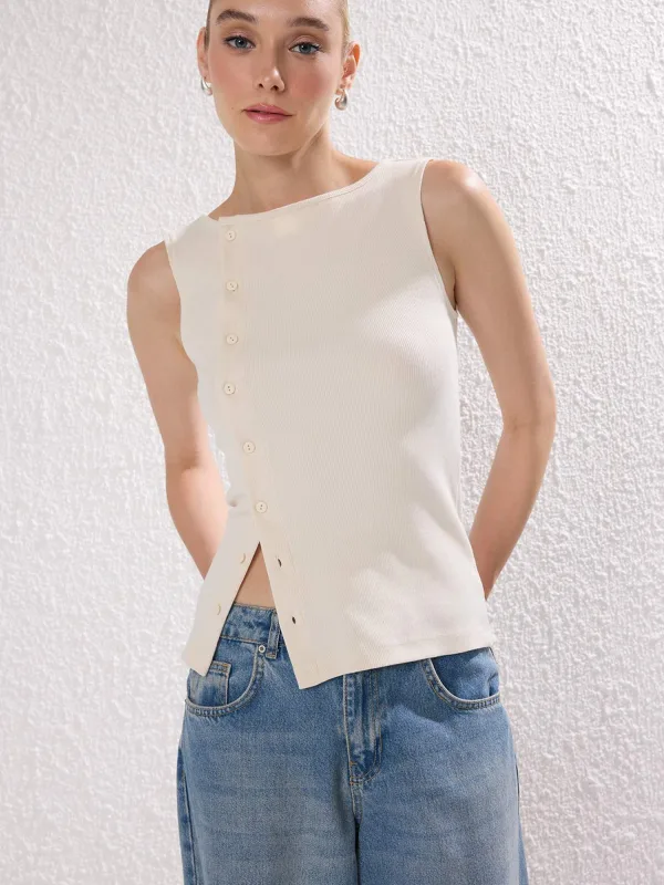Design: Gevoerde zoom/rand, Geribbelde kraag, Rechte zoom, Knop placket, Geribbeld gebreid; Materiaal: Jersey; Halstype: Ronde hals; Motief: Effen; Soort bandjes: Normale bandjes; Extra's: Op staal naden, Voelt zacht aan, Huidvriendelijk materiaal; Pasvorm: Slanke pasvorm; Armlengte: Mouwloos; Lengte: Normale lengte