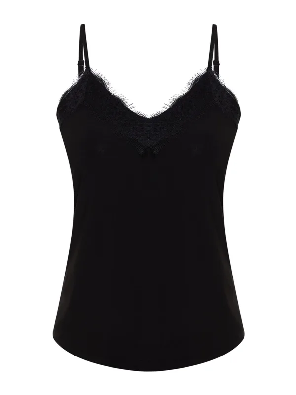 Design: Gevoerde zoom/rand, Rechte zoom, Zoom/rand met boord; Materiaal: Jersey; Halstype: V-hals; Motief: Effen; Soort bandjes: Spaghettibandjes; Details: Kant; Extra's: Verstelbare bandjes, Op staal naden, Voelt zacht aan, Huidvriendelijk materiaal; Pasvorm: Normale pasvorm; Armlengte: Mouwloos; Lengte: Normale lengte