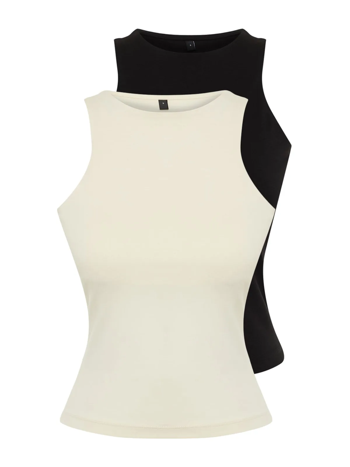 Design: Gevoerde zoom/rand, Rechte zoom; Materiaal: Jersey; Halstype: Ronde hals; Motief: Effen; Extra's: Op staal naden, Voelt zacht aan; Pasvorm: Normale pasvorm; Aantal: 2 Pack; Armlengte: Mouwloos; Lengte: Korte pasvorm