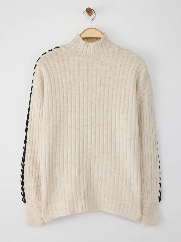 Design: Rechte zoom, Geribbeld gebreid, Overcut schouder; Materiaal: Knitwear; Halstype: Opstaande kraag; Motief: Effen; Details: Borduursels; Extra's: Fully fashioned, Met textuur; Pasvorm: Losse pasvorm; Armlengte: Lange mouw; Lengte: Normale lengte