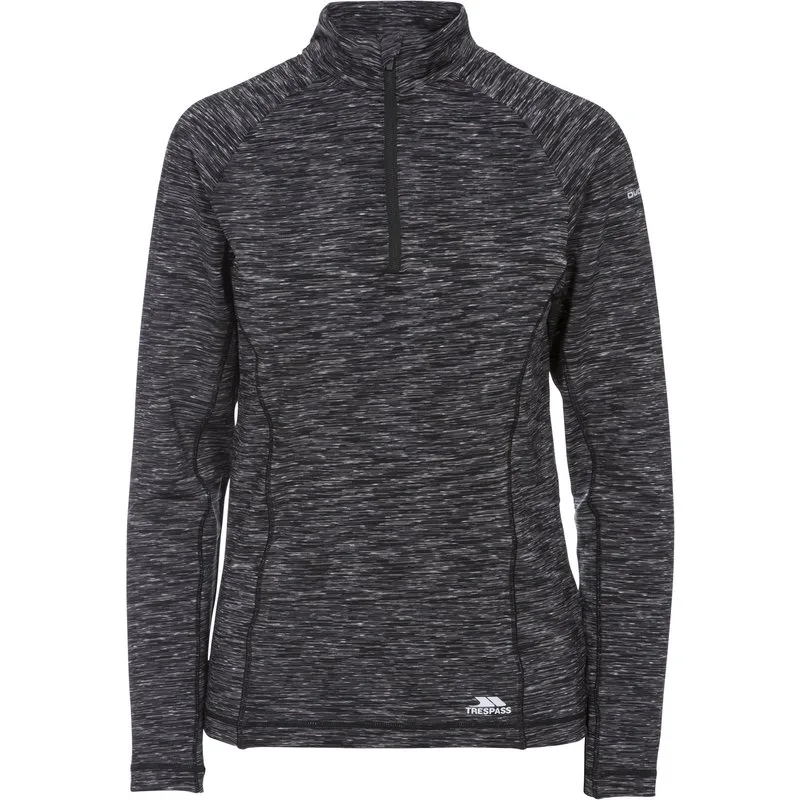 Half zip met troyerkraag Lange mouwen Kleine achterzak met rits Contrasterende binnenste nekbinding Reflectieve print bij de logo's Vochtafdrijvend Droogt snel op 87% Polyester, 13% Elastaan Borstomvang Trespass Dames (ca.): XS / 81 cm, S / 86 cm, M / 91,4 cm, L / 96,5 cm, XL / 101,5 cm , XXL / 106,5 cm.