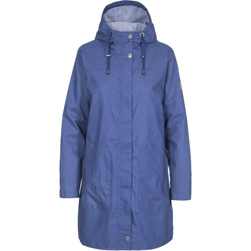 Wasachtig linnen Chambray voering Vaste verstelbare capuchon 2 zakken met rits Koordbinders op de capuchon Ventilatie aan de achterkant met studs Verstelbare manchetten Lange lengte Waterdichte 3000 mm, ademende 3000 mvp, winddichte, getapete naden Buitenlaag: 55% linnen / 45% katoen, PU-coating, voering: 50% katoen / 50% polyester Borstomvang Trespass Dames (ca.): XS / 81 cm, S / 86 cm, M / 91,4 cm, L / 96,5 cm, XL / 101,5 cm , XXL / 106,5 cm.