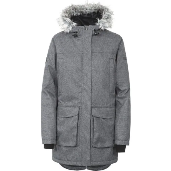 Gewatteerd Voering van imitatiebont Vaste verstelbare capuchon Rand van imitatiebont op de capuchon 2 zakken met rits 4 zakken Elleboogpijltjes Verborgen gebreide manchet Ventilatie aan de achterkant Lange lengte Waterdichte 8000 mm, ademende 3000 mvp, winddichte, getapete naden Buitenkant: 100% polyester TPU-membraan, voering: 100% polyester, vulling: 100% polyester Borstomvang Trespass Dames (ca.): XS / 81 cm, S / 86 cm, M / 91,4 cm, L / 96,5 cm, XL / 101,5 cm , XXL / 106,5 cm.