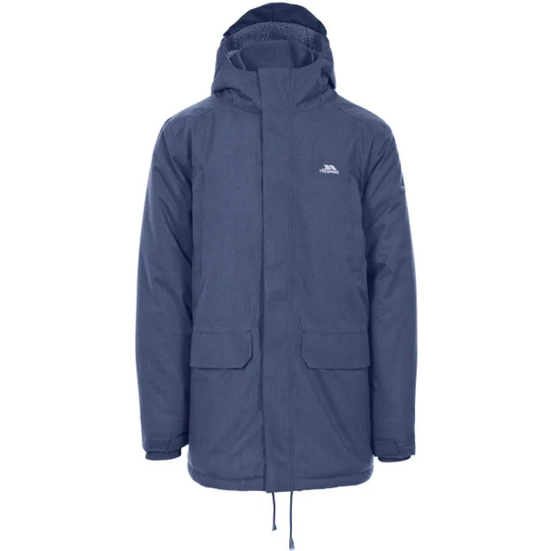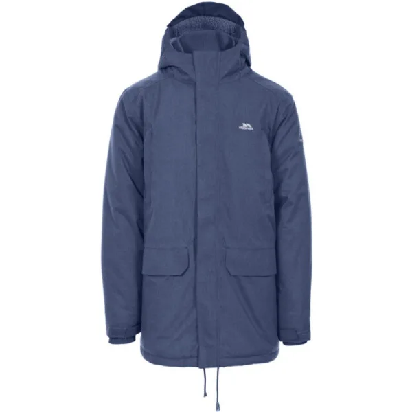 Gewatteerd Vaste verstelbare capuchon 4 zakken Geribbelde binnenmanchet en kraag Super zachte voering Verstelbare manchet met tab Binnenzak Kin bescherming Waterdichte 8000 mm, ademende 3000 mvp, winddichte, getapete naden Buitenkant: 100% polyester TPU-visgraatwollook, voering: 100% polyester, vulling: 100% polyester Borstomvang Trespass heren (ongeveer): S - 89-94cm, M - 96.5-101.5cm, L - 104-109cm, XL - 111.5-117cm, XXL - 117-122cm, 3XL - 122-127cm.