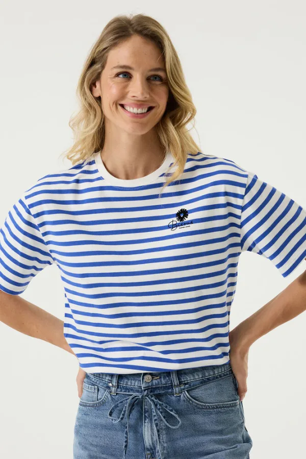 Gestreept T-shirt met subtiele borstprint. Dit T-shirt heeft een ronde hals, korte mouwen en een loose fit. Dit item is gemaakt van 100% katoen. Better Cotton is een initiatief dat zich wereldwijd inzet voor betere omstandigheden in de katoenindustrie.
