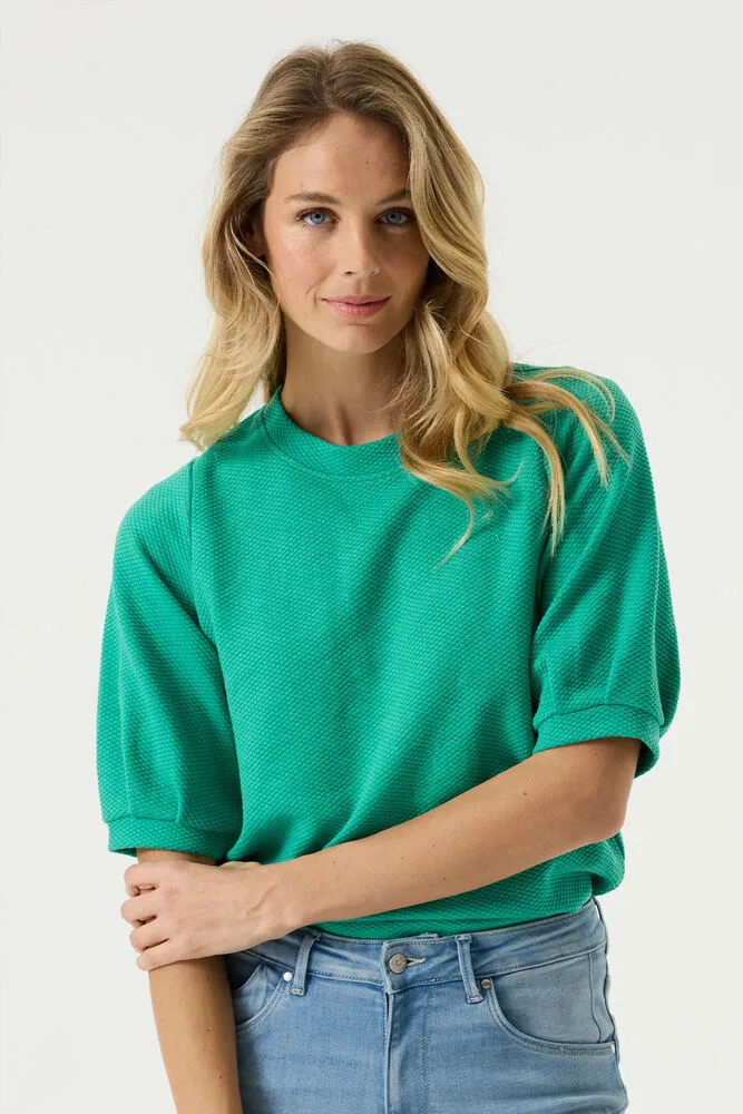 Trui van een jacquardgeweven stof. Deze trui heeft een ronde hals, 3/4 mouwen en een regular fit. Dit item is gemaakt van 85% polyester en 15% viscose. Hergebruik van materialen draagt bij aan een circulaire economie.