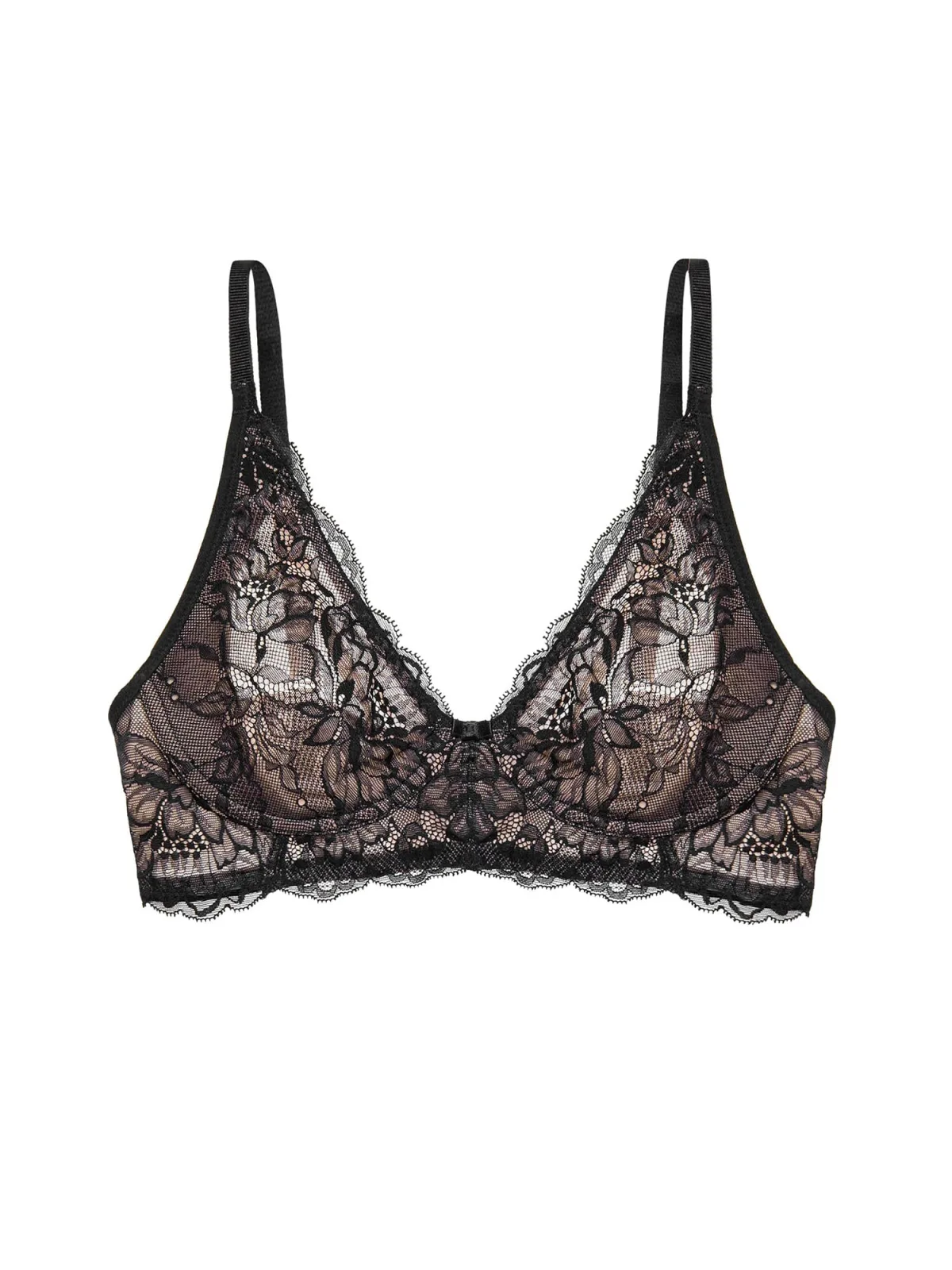 Cup soorten: Soft cup bh; Soort bandjes: Normale bandjes; Bh/bikini type: T-shirt; Beugel: Zonder beugel; Motief: Bloemenprint; Details: Kant; Extra's: Licht transparant