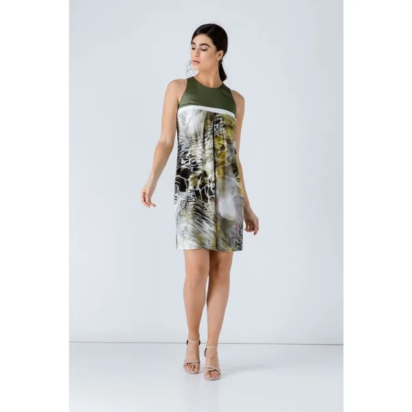 Mouwloze jurk met een ronde halslijn. De bovenkant is van stretch kaki gabardine dubbele stof en het onderste deel is van bedrukte jersey stof, viscose-elastaan. Tussen de twee zit een ecru horizontale strook. Sluit op de rug met 3 sierknopen. Drie plooien aan de voorkant. Opent onder de buste in een A-lijn silhouet. Ons model is 172cm en draagt maat 36/S. Afmetingen voor maat 36 (in cm): Schouder -23; Borst-45; Taille-47; Onderkant-57; Lichaamslengte-92.