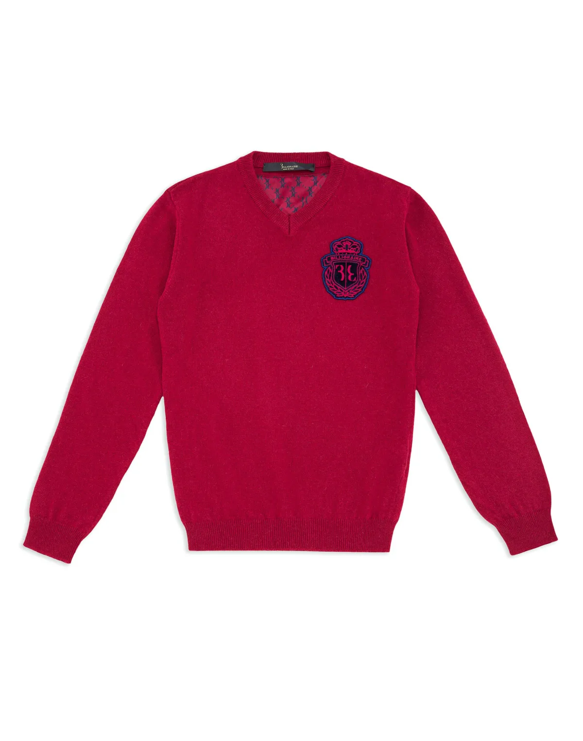 Wool V-neck pullover enriched by velvet inserts. Embroidered crest patched at left chest. Ribbed collar, cuffs and bottom.