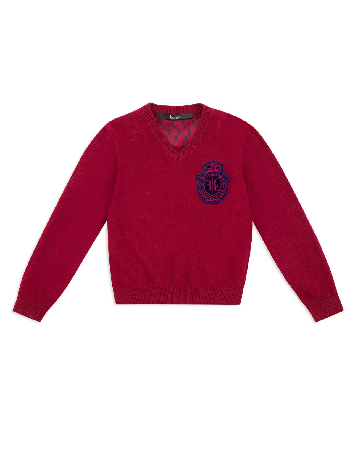 Billionaire cannot give up the emblem, one of its most important features. On this knitted wool V-neck sweater it is embroidered on the velvet patch sewn at left chest. Velvet inserts on the sides. Ribbed neckline, cuffs and bottom hem.