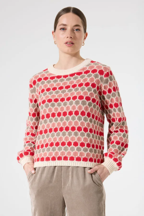 Ttrui met ingebreid patroon. Deze trui heeft een ronde hals, lange mouwen en een regular fit. Dit item is gemaakt van 59% katoen, 39% acryl en 2% metallic garen, wat zorgt voor een unieke uitstraling en een comfortabel gevoel. Better Cotton is een initiatief dat zich wereldwijd inzet voor betere omstandigheden in de katoenindustrie.