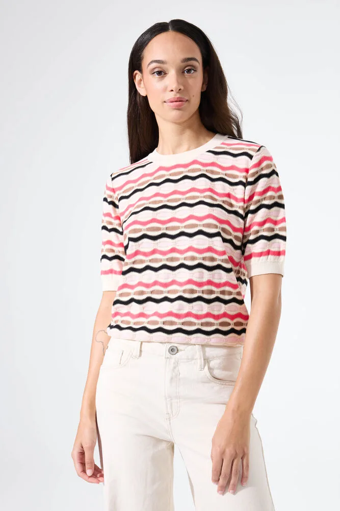 Trui met een opvallend patroon. Deze trui heeft een ronde hals, korte mouwen en een regular fit. Dit item is gemaakt van 90% katoen en 10% metallic garen, wat zorgt voor een comfortabele en speelse uitstraling. Better Cotton is een initiatief dat zich wereldwijd inzet voor betere omstandigheden in de katoenindustrie.