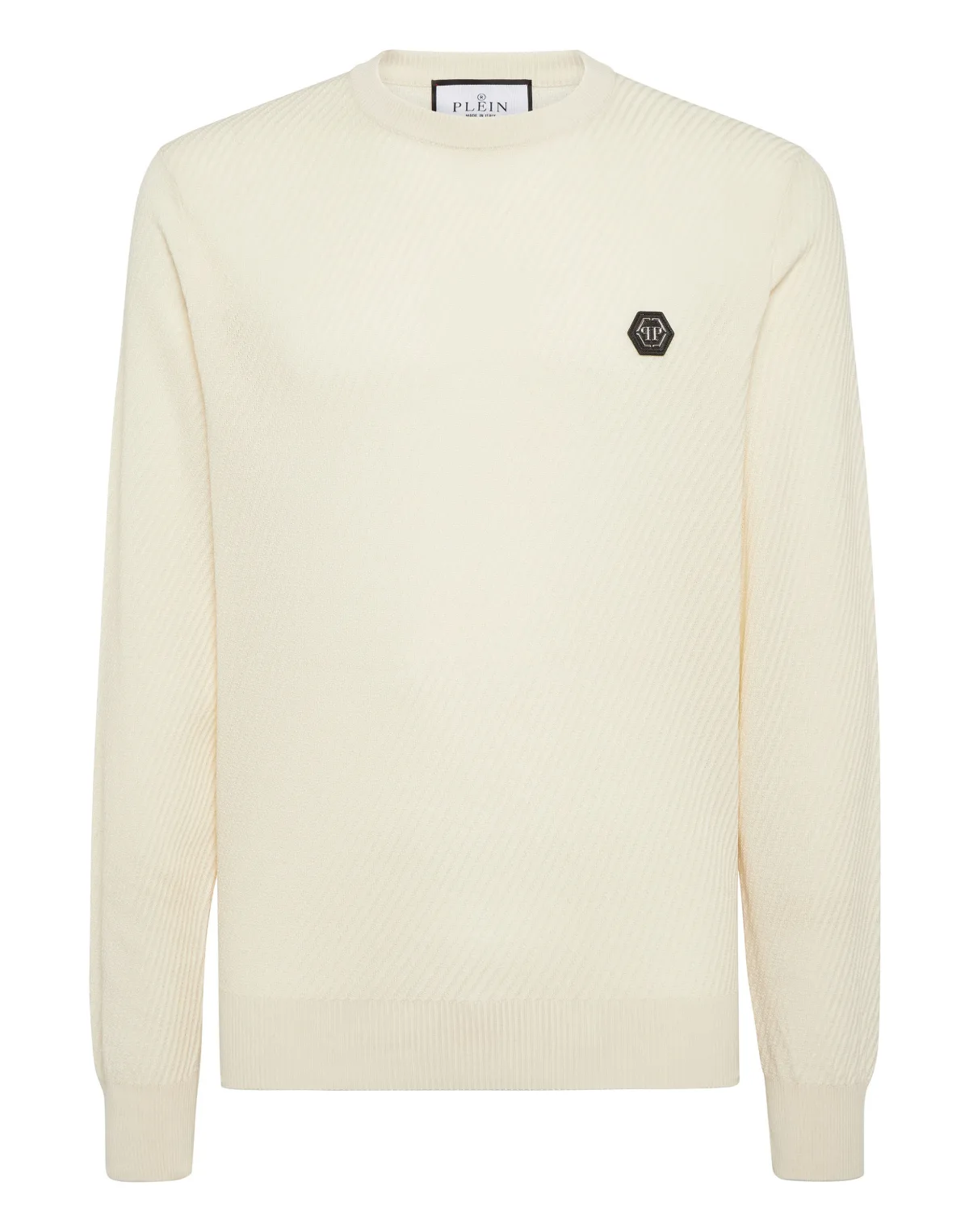 Innovatie en creativiteit zijn de wortels van de stijl van Plein. Ontdek de kenmerken van deze speciale, met garen gebreide pullover met ronde hals. 8-gauge gebreide zijde en merinowol Diagonale ribsteek Logo patch Ribgebreide zomen