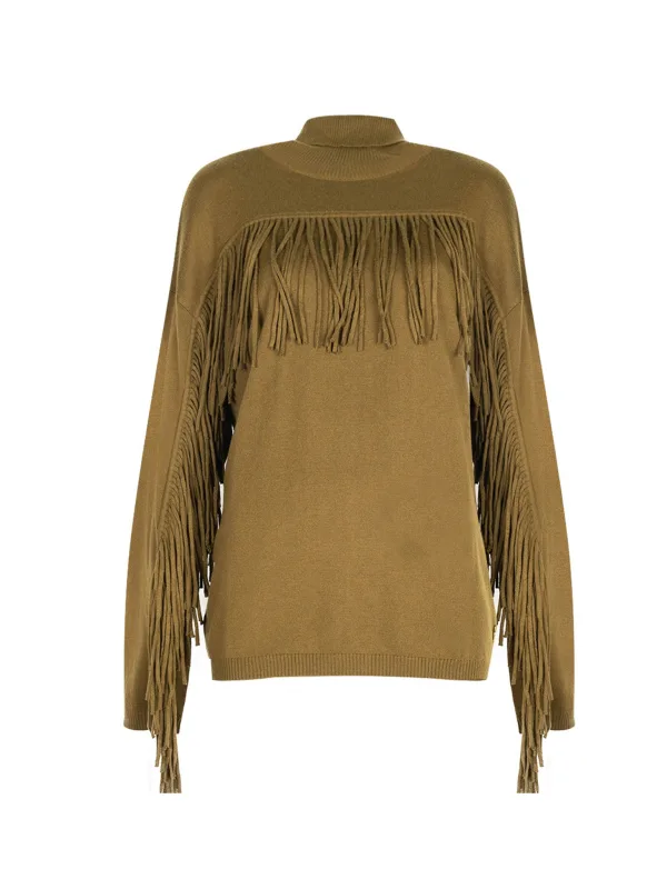 Eenvoudige pasvorm Golf Met lange mouwen Hals, mouwen en zoom met geribde boorden Voorkant en mouwen versierd met franjes Merkdetail op de voorkant Gemaakt van hoogwaardige stof met wol