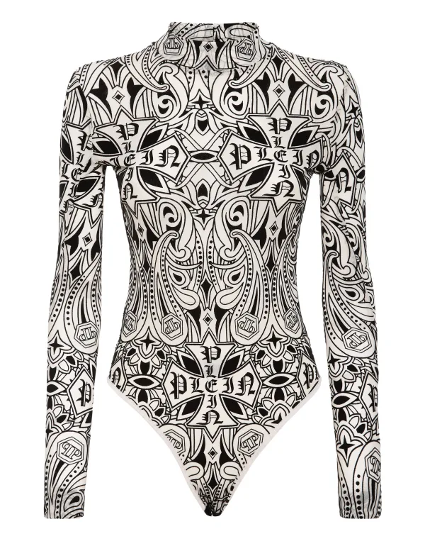 Ontdek het plezier van origineel zijn met deze romper met lange mouwen van stretch tule met een all-over print. Stretch tule Stof versierd met een all-over flockedessin Mouwuiteinden met duimgaten Hoge hals Dubbelnaalds afgewerkte randen Drukknopen