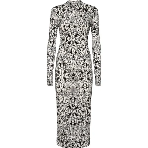 Als je van glamour houdt, raden we je deze midi-jurk aan die speelt met contrasterende effecten. Ontdek de aandacht voor detail. Stretch polyester tule Stof versierd met all-over flocked motieven Open rug Knoopsluiting achter in de nek Schouders benadrukt door interne vulling