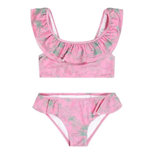 De meisjes bikini Santa Catarina van Tumble 'n Dry brengt meteen een zonnige sfeer in de kledingkast. Deze roze bikini heeft een speelse all-over print en lieve ruches, waardoor de bikini er vrolijk en eigentijds uitziet. De top heeft een bandeau-look met smalle bandjes en sluit mooi aan op het lichaam. Het soepele stretchmateriaal met elastaan beweegt makkelijk mee, zodat spelen in het water en op het strand comfortabel blijft.Speelse details voor zomerse dagen Roze kleur met all-over print, ideaal voor zomerse looks Bandeau-top met smalle bandjes en ruches langs de bovenrand Bikinislip met bijpassende ruches voor een mooi geheel Soepel stretchmateriaal met elastaan voor een fijne pasvorm Geschikt voor peuters, kleuters, schoolkinderen en tieners Hygiënetip: badkleding altijd passen over het eigen ondergoed Onderhoudsvriendelijk: handwas, niet strijken en niet in de drogerComfortabel in het water en op het strandDeze bikini is ideaal voor zwemles, een dagje strand of spelen in de tuin met het zwembadje. Het elastische materiaal blijft goed zitten tijdens bewegen en springen, terwijl de zachte stof prettig aanvoelt op de huid. Na het zwemmen is de bikini eenvoudig uit te spoelen en te laten drogen.Tumble 'n Dry voor actieve kidsTumble 'n Dry staat bekend om kinderkleding met comfortabele pasvormen en moderne prints. De ontwerpen zijn gemaakt met aandacht voor bewegingsvrijheid, zodat kinderen zorgeloos kunnen rennen, spelen en ontdekken. Met deze bikini kies je voor vrolijke swimwear die past bij een actieve kinderwereld.Een fijne keuze voor zonnige dagen vol waterpret.