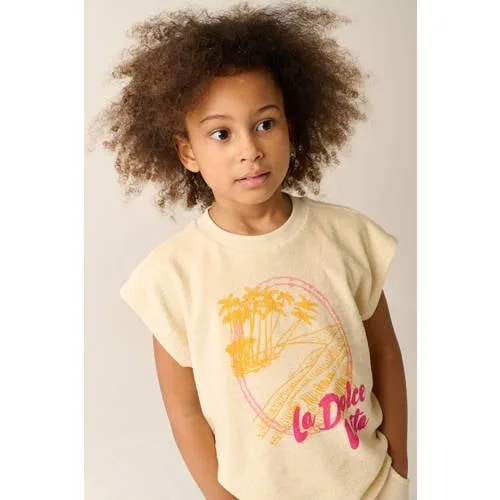 Fris, speels en makkelijk te combineren, dit lichtgele meisjes T-shirt van Tumble 'n Dry is een praktische basic voor elke dag. Het shirt heeft korte kapmouwen en een ronde hals, waardoor het veel bewegingsvrijheid biedt en net even anders oogt dan een standaard T-shirt. De zachte katoenkwaliteit met badstofstructuur voelt prettig aan op de huid en geeft een sportieve, urban uitstraling. Door de meerkleurige print krijgt elke outfit meteen extra kleur.Lichte stof met vrolijke details Gemaakt van 100% katoen, dat zacht aanvoelt en prettig draagt tijdens actieve dagen Lichtgele kleur met meerkleurige print voor een frisse, zomerse look Korte kapmouwen en ronde hals voor extra bewegingsvrijheid Zonder sluiting, kan eenvoudig over het hoofd worden aangetrokken Past bij een co-ord set, combineerbaar met een bijpassend broekje of rok Geschikt voor schoolkinderen en tieners door de pasvorm Wasbaar op 30 graden en lauw strijkbaar, niet geschikt voor de droogtrommelVoor school, speelplein en vrije tijdDit T-shirt combineert makkelijk met jeans, een korte broek of een rok. Het is geschikt voor een schooldag, een middag buiten spelen of een uitstapje in het weekend. De lichte stof en korte mouwen maken het passend voor warmere dagen, en met een vest erover kan het ook in het voor- en najaar worden gedragen.Tumble 'n Dry: eigentijdse kinderkledingTumble 'n Dry richt zich op kinderkleding die comfort combineert met een eigentijdse stijl. De collecties sluiten aan op het dagelijks leven van actieve kids, met materialen die prettig aanvoelen en designs die meegaan in de laatste trends.Een licht T-shirt dat snel een vaste plek in de kledingkast krijgt.