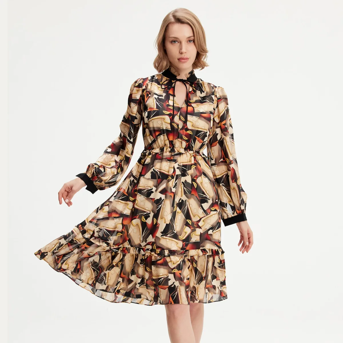 Een kleurrijk en dynamisch stuk met een vloeiende en comfortabele snit. Versierd met ruches aan de kraag, taille en zoom, uitlopend volume, kraag en manchetten in contrast met effen stof. Te combineren met sandalen in de lente of laarzen en perfecto in de herfst. Productdetails • Vorm: gebogen en wijd uitlopen • Lengte: 106 cm • Hoge kraag, v • elastische taille • Lange mouwen met manchetten • Aandoen