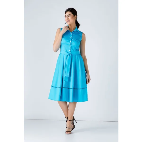 Turquoise mouwloze jurk van lichtgewicht geweven stretch gabardine stof. Kraag en sluiting vooraan tot aan de zoom met decoratieve knopen in schelpstijl. Decoratief geperforeerd vlechtwerk, toon op toon, onder de schouders voor en achter en 19 cm van de zoom. Naaddetail vooraan. Darts bij de buste. Riem in dezelfde stof, 5cm breed, met plooien voor en achter. 2 binnenzakken vooraan. Ons model is 172cm en draagt maat 36/S. Afmetingen voor maat 36 (in cm): Schouder -34; Borst-42; Taille-36; Onderkant-68; Lichaamslengte-112.97%katoen-3%elastan