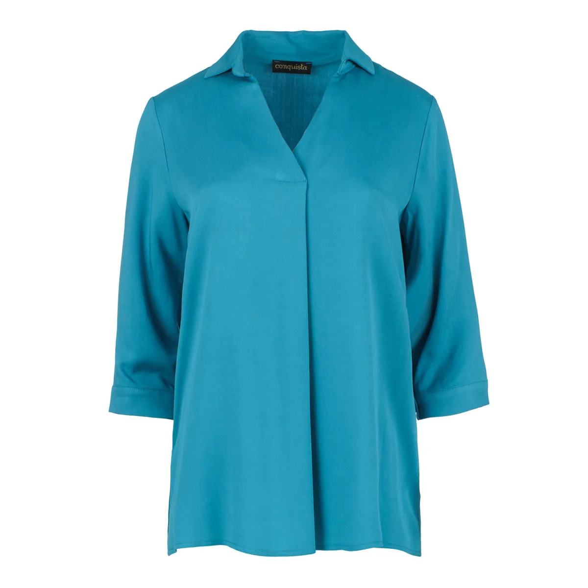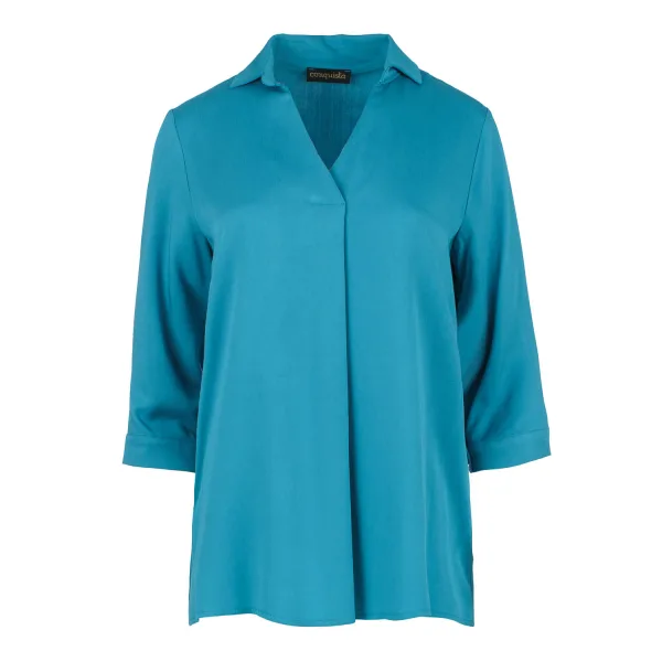 Deze zomertop is gemaakt van turquoise geweven stof. Het heeft een kraag met een V-hals en een plooi aan de onderkant. Het heeft ¾ lengte mouwen met manchetten die sluiten met een tone on tone plastic knoop. Het overhemd heeft binnen zijzakken. Dit kledingstuk is gestileerd in een ontspannen subtiel A-lijn silhouet.