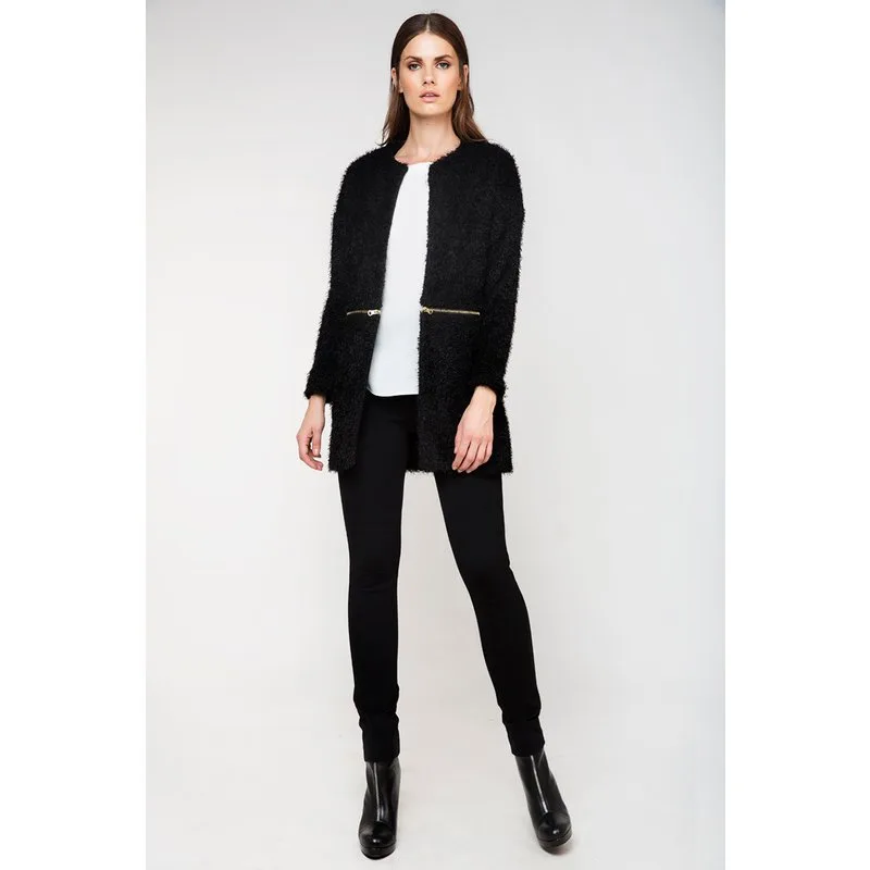 Twee-in-één jas van gebreide pluizige stof. Lange mouwen en een open voorkant. Op de taille zorgt een gouden ritssluiting ervoor dat het onderste gedeelte kan worden verwijderd, waardoor een cropped jas ontstaat. Recht silhouet. Volledig gevoerd. Lengte: 82 cm voor maat 36.
