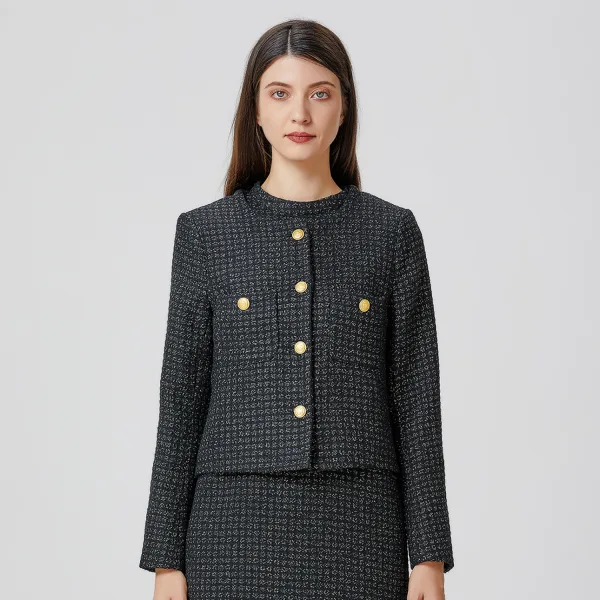 Een jasje versierd met opgestikte zakken en gouden knopen. Gemakkelijk te dragen en te combineren met jeans, broeken en rokken. Een stuk dat geschikt is voor professionele of semi-formele gelegenheden, voor een gepolijste look en verfijnde stijl. Productdetails: Vorm: recht Lengte: 53cm Ronde kraag Lange mouwen Knoopsluiting middenvoor