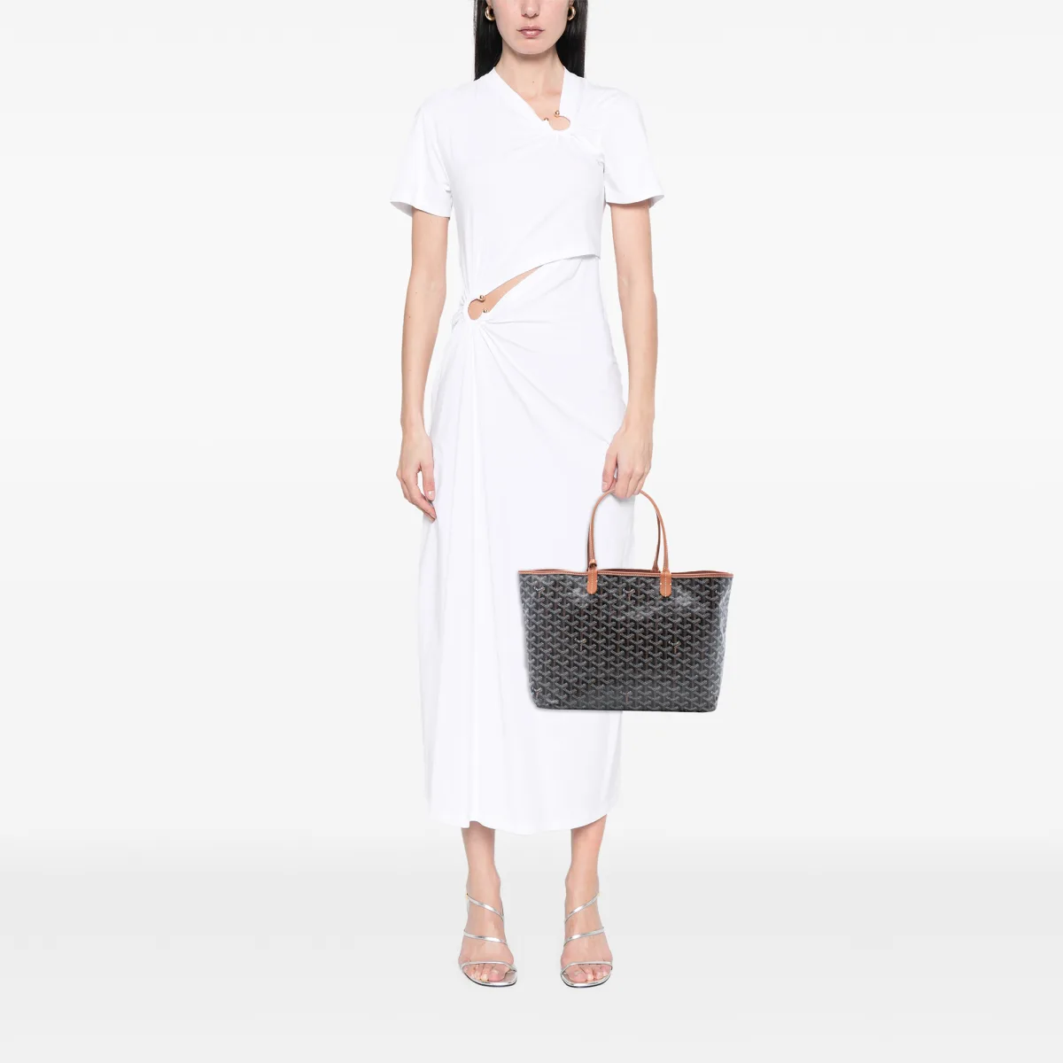 Draag, stijl, ontdek. Verhoog je dagelijkse routine met deze iconische tweedehands Goyardine Saint Louis PM tote. Gemaakt van duurzaam gedrukt gecoat canvas, biedt het een verfijnde maar praktische oplossing voor jouw essentials. Het ruime ontwerp biedt moeiteloos plaats aan je dagelijkse benodigdheden, zodat je altijd voorbereid bent. Het robuuste gecoate canvas zorgt voor langdurig gebruik en eenvoudig onderhoud, waardoor het perfect is voor drukke levensstijlen. Een tijdloos accessoire, het past naadloos van stadsboodschappen naar weekenduitjes en voegt een vleugje ingetogen luxe toe aan elke outfit. Afmetingen: 27 x 33,5 x 14 cm Staat Beoordeling: AB Informatie over de staat: Achterkant buitenkant geplooid. Sleutel krasjes. Hoeken buitenkant versleten. Voorkant buitenkant geplooid. Handvat buitenkant bevlekt met anders. Binnenvoering bevlekt met anders. Praktische bevestiging krasjes. Zijkant buitenkant geplooid.