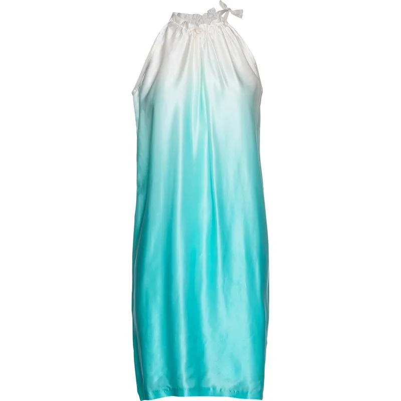 Zomerjurk van geweven zijde in satijnstijl met een tweekleurige print. Halterneklijn met een 3 cm brede stropdas van hetzelfde materiaal die door de stof loopt en aan de zijkant van de hals vastknoopt voor een licht gerimpelde look. Los A-lijn silhouet. Volledig gevoerd. Knielengte. Afmetingen voor maat /36S (in cm): Borst-49, Taille-53, Hemline-53, Lichaamslengte-97. 100% zijde.