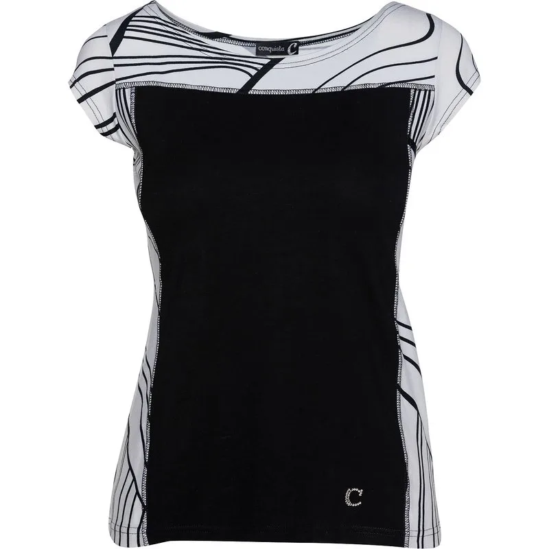 Schitter dit seizoen in deze bijzondere top van Conquista. Een eigentijdse flitsende print dient als achtergrond voor een effen vierkant, wat dit gemakkelijk te dragen kledingstuk en duidelijk contrast geeft. Combineer met een effen rechte broek of een stijlvolle midirok voor een perfecte look.