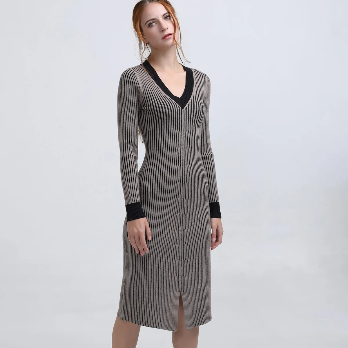 Gemakkelijk te dragen en altijd in stijl, deze trui jurk zal je beste bondgenoot zijn tijdens het koude seizoen. Verbetering van uw silhouet door een subtiele set geribbelde texturen, contrasterend langs de nek en polsen, subtiele spleet op de zoom vooraan. Zacht en comfortabel om het hele seizoen te dragen. Productdetails: • Formulier: aangepast • V halslijn • Lange mouwen