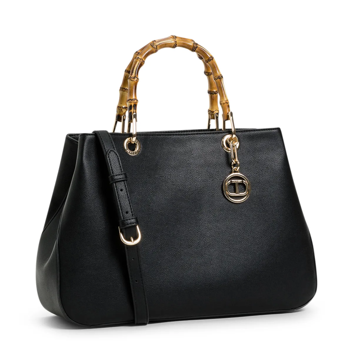 Kleur: Zwart 00006 Zwart Sluiting: Magneet Schouderband: Afneembaar, 52 cm lang en dubbel bamboe handvat Binnenkant: Groot vak met logovoering en ritsvak Afmetingen: Hoogte 25 cm | Breedte 37cm | Diepte 11,5 cm