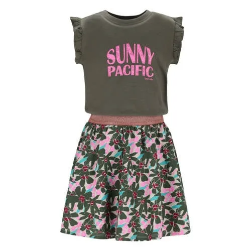 Geef haar zomergarderobe een frisse update met de TYGO & vito meisjesjurk Jess in olijfgroen met roze accenten. Deze luchtige zomerjurk is gemaakt van 100% katoen in een soepele jersey kwaliteit, waardoor de stof zacht aanvoelt op de huid. De vrolijke bloemenprint en speelse tekstdetails zorgen voor een levendige look die perfect past bij zonnige dagen, speelafspraken en school.Zomerse details waar zij blij van wordt Mouwloos model met ronde hals voor een luchtig en comfortabel gevoel op warme dagen Elastische tailleband die netjes aansluit en zorgt voor een mooie, speelse pasvorm Gemaakt van 100% katoen in een zachte jersey kwaliteit, prettig om de hele dag te dragen Olijfgroene jurk met roze details, bloemenprint en tekstprint voor een vrolijke uitstraling Korte lengte, ideaal als zomerjurk voor peuters, kleuters en schoolkinderen Ruches als subtiel detail voor extra beweging en een speels effect Eenvoudig te onderhouden, wasbaar op 30 graden en warm strijkbaarElke dag klaar om te gaanDeze Jess jurk uit de daily collectie is gemaakt voor alledaagse momenten. Naar school met sneakers, naar het speeltuintje met sandalen of tijdens een familiedag met een vest erbij, ze is in één keer aangekleed en klaar om te gaan. De elastische tailleband maakt aan- en uittrekken bovendien heel eenvoudig.Speelse stijl van TYGO & vitoTYGO & vito staat bekend om kinderkleding met een stoere en vrolijke uitstraling, waarin kinderen zich vrij kunnen bewegen. De ontwerpen sluiten aan op het dagelijkse leven van actieve kids, met aandacht voor comfort, pasvorm en herkenbare prints. Zo combineer je praktische kleding met een stijl die past bij hun eigen karakter.Een fijne, dagelijkse zomerjurk waar zij zich makkelijk en vrij in kan bewegen.