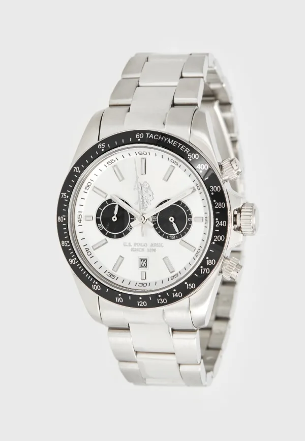 Chronograaf beweging (hoge precisie) 42mm roestvrijstalen kast Roestvrijstalen bezel met zwarte bedrukking Zilveren wijzerplaat met zwarte tellers, zilveren details en luminescentie Roestvrijstalen achterdeksel / Roestvrijstalen kroon Hoge weerstand mineraalglas Roestvrijstalen band met gepersonaliseerde roestvrijstalen gesp Waterdicht tot 5 ATM