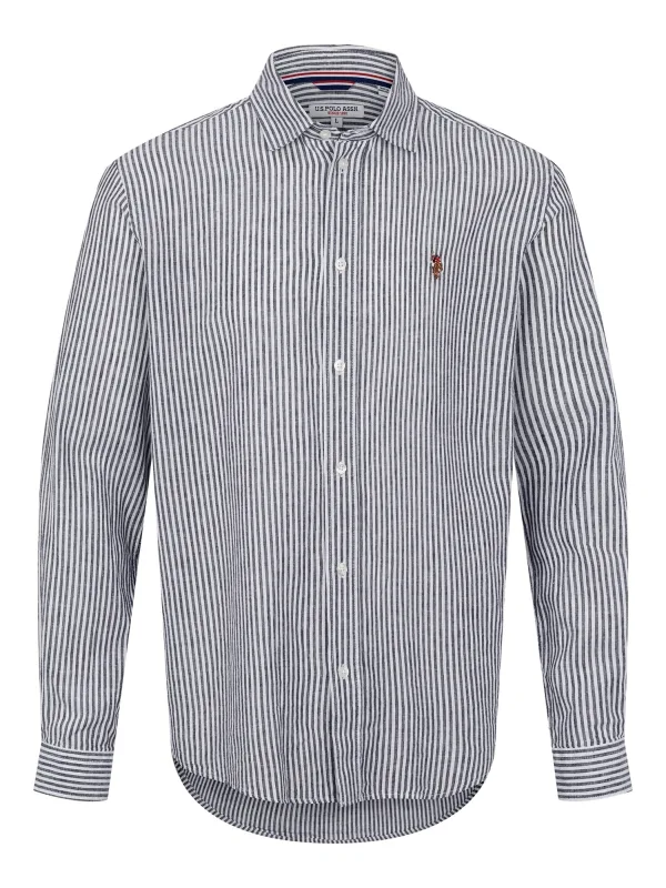 Design: 1-knoops manchetten, Gevoerde zoom/rand, Knop placket, Ronde zoom; Type sluiting: Knoopsluiting; Materiaal: Linnen; Motief: Gestreept; Kraag: Kentkraag; Extra's: Label borduurwerk, Huidvriendelijk materiaal; Pasvorm: Regular fit; Armlengte: Lange mouw