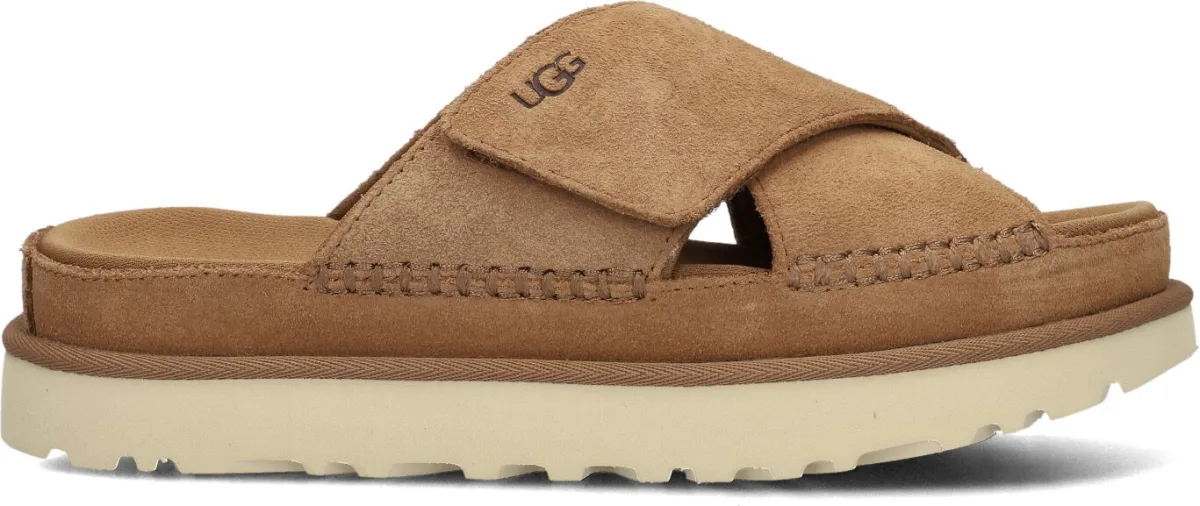 Stap in stijl met de W GOLDENSTAR CROSS SLIDE slippers van UGG. Deze trendy slippers in cognac suède passen perfect bij de bruine tinten van dit seizoen. Het bovenwerk is voorzien van twee bruine banden, waarvan één met klittenband. Met een comfortabele plateauzool zijn ze ideaal voor een dagje shoppen of een zomerse wandeling. Combineer ze met een luchtige jurk of een trendy jeans voor een casual-chique look. Laat je voeten stralen met deze must-have slippers van UGG!